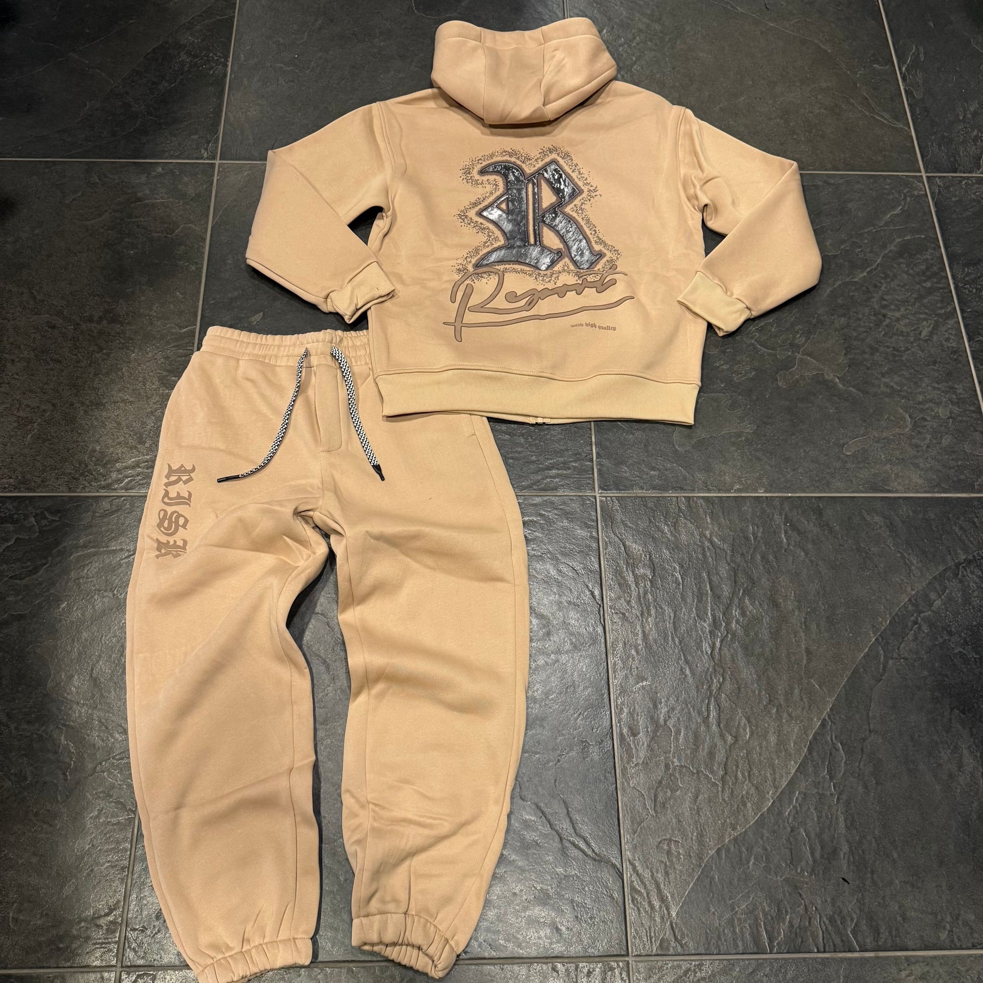 tuta ricamo lato cuore e stampa retro felpa zip con cappuccio + pantatuta con elastico alle caviglie
