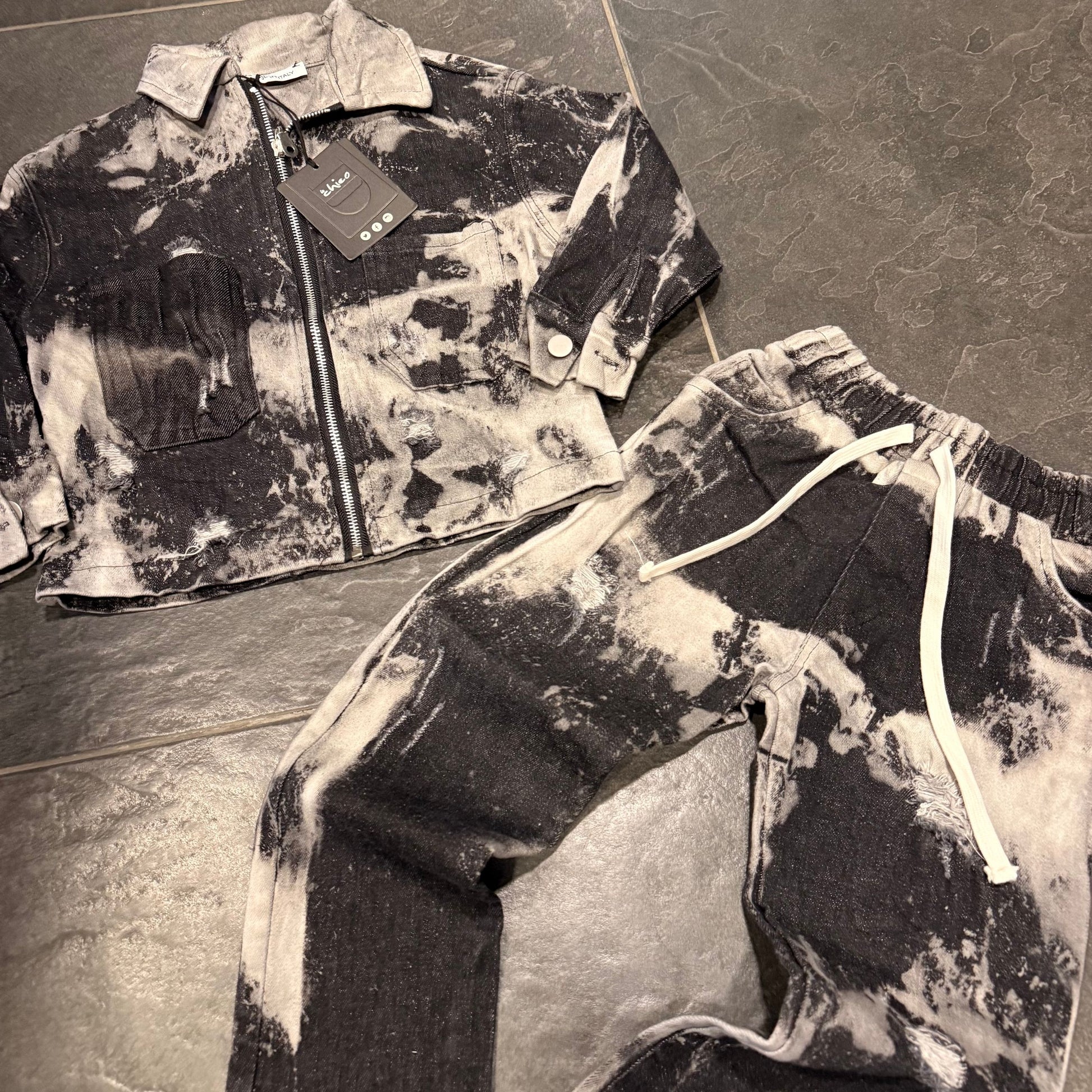 -cordset jeans sfumato camicia con colletto e chiusura zip + jeans con elastico in vita