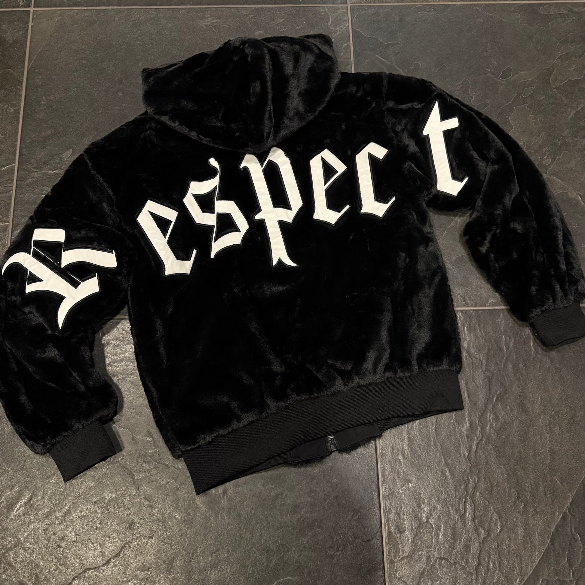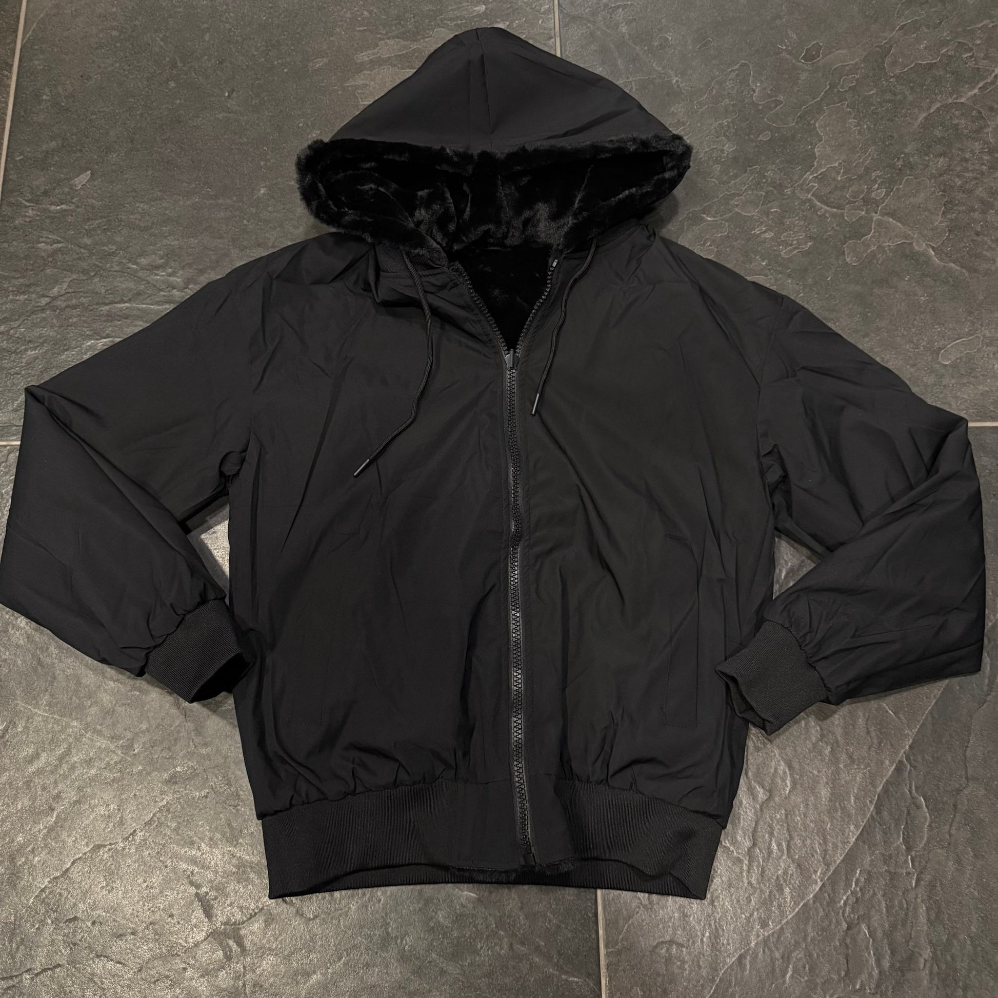 giubbino reversibile con cappuccio e pelliccia con scritta retro